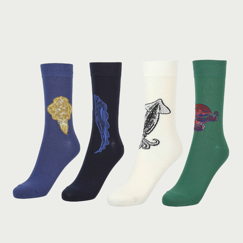 釣り好き魚好きにおすすめのUO-SOCKS第一弾は「アオリイカ」「スルメイカ」「タチウオ」「マダ コ」の4種。綿混のハイゲージ糸を使用し、柔らかく履き心地抜群の高品質な日本製ソックスが完成。 ぜひ、お気に入りの一足を見つけてください!