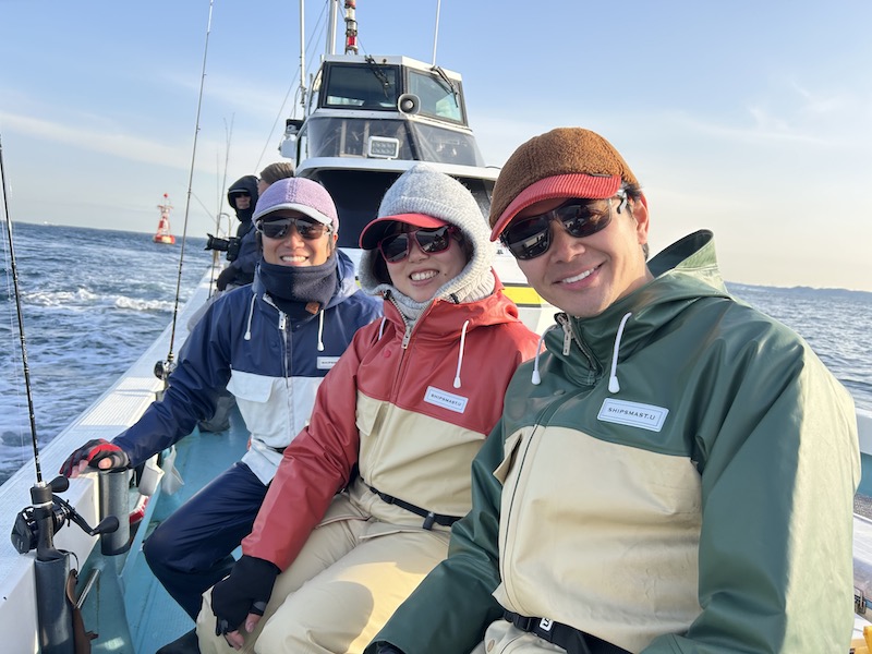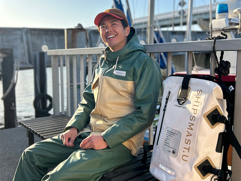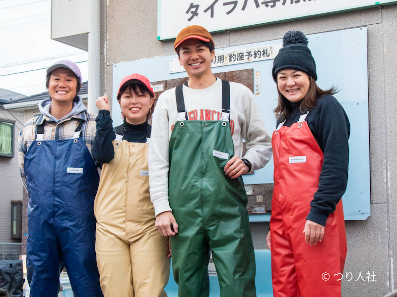 参加メンバーはスタッフ山口と秋山、カタログ出演もしてくださっている釣り好きモデルの萩原真一さん、サポートスタッフの古川の4名です。SHIPSMAST.Uのサロペットはネイビー、ベージュ、カーキ、レッドと4カラーあるので、それぞれ好みのカラーを選んで着用し、いざ出船です!