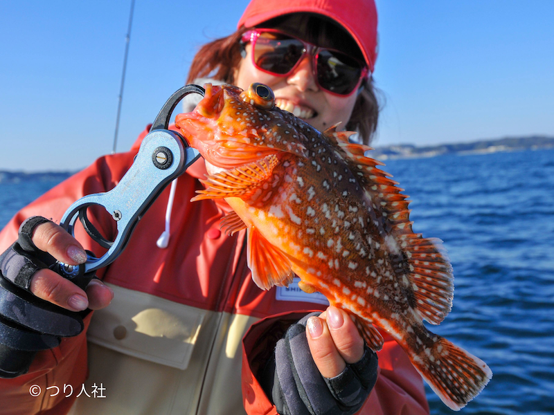 パターン的にちょっとゆっくり目と感じた古川は萩原さんに「巻きをゆっくり目に」と指示。するとほどなく萩原さんにアタリが。「ゆっくり巻き続けて!」と、上がってきたのはホウボウ。タイラバ初挑戦でなんとか釣り上げることができ、萩原さんもほっと一安心の笑顔。