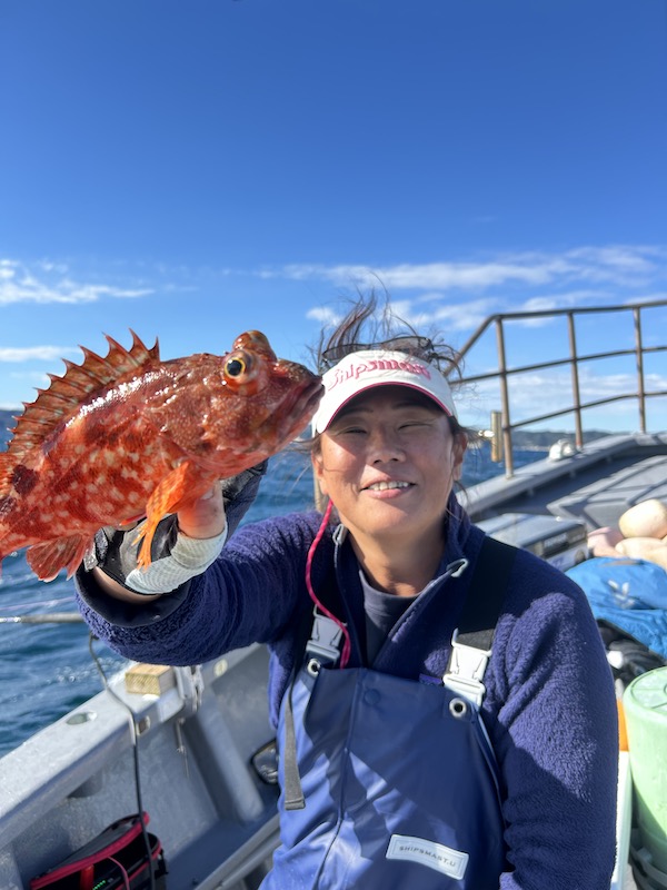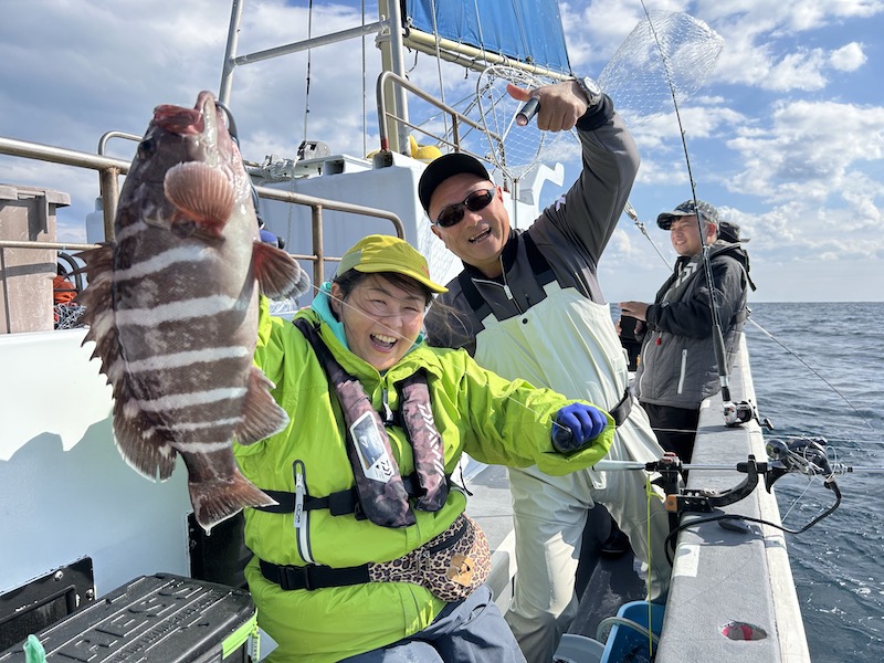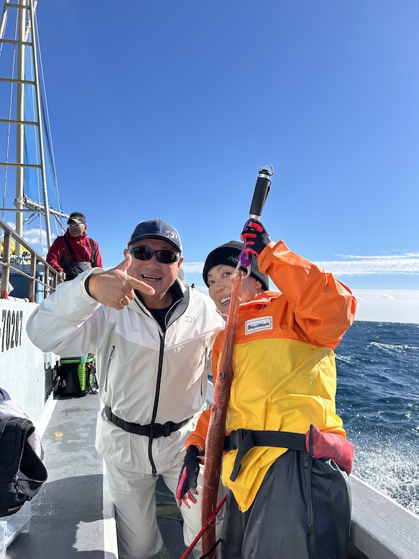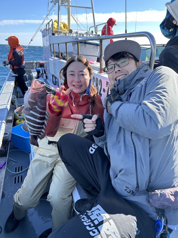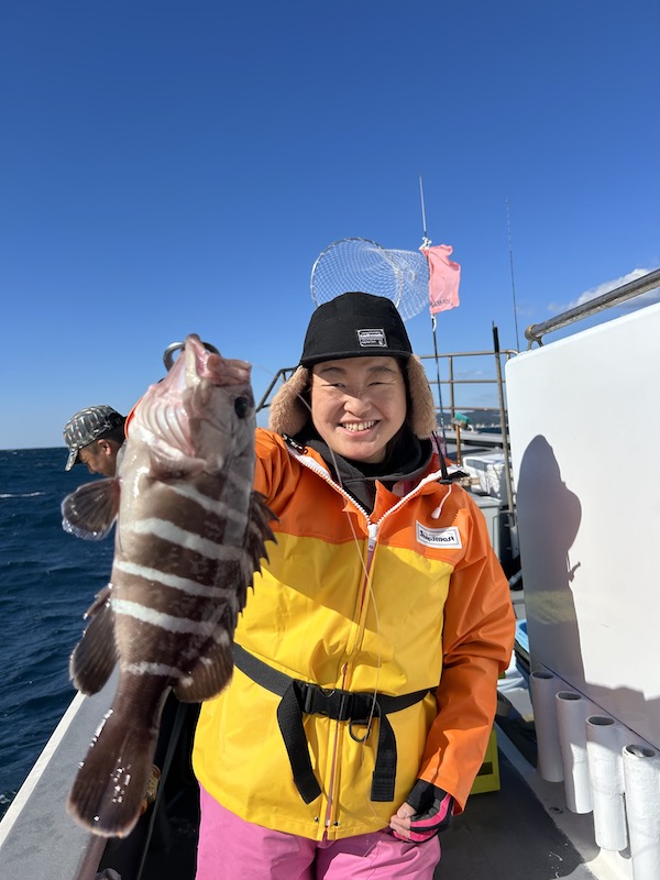 残念ながら自分の仕掛けにかからなかった参加者も「次は絶対に自分の力で釣りあげたい!」と宣言した直後、また竿が大きく曲がるヒットが。一度は根に潜られてしまいましたが、若船長さんの力もお借りして、無事釣り上げることができました。