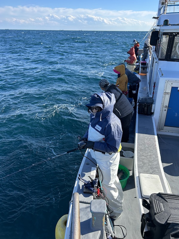当日も風波が強く、大きくポイント移動はできませんでしたが、初の泳がせ釣りに皆さん期待MAXで仕掛けを落としていきます。